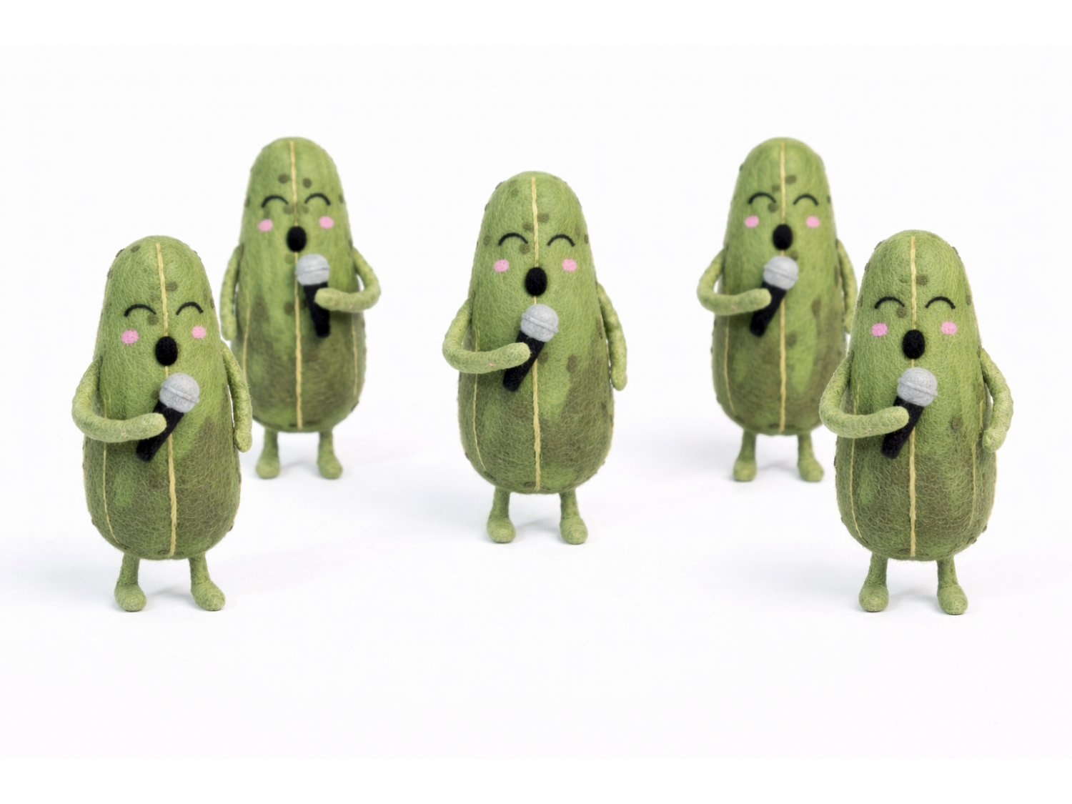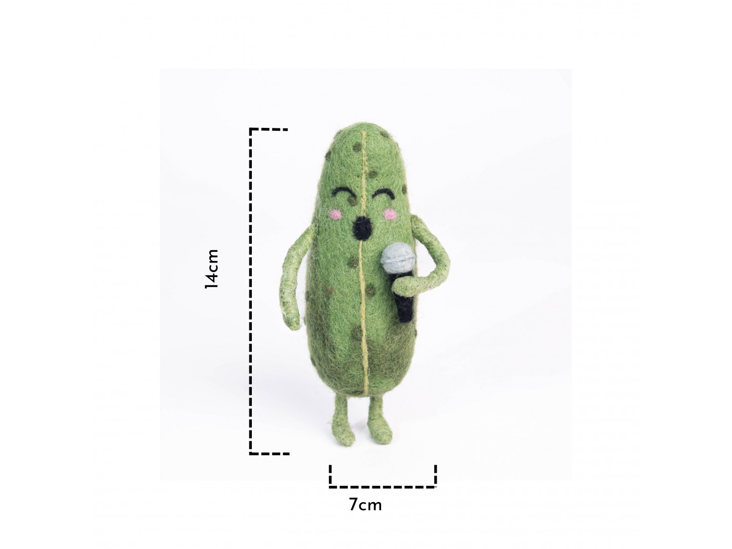 This Handmade Wool Felt Singing Cucumber Character brings a playful twist to everyday felt toys, featuring a lively veggie design holding a miniature microphone. Handcrafted from natural wool by skilled women artisans in Nepal, the piece captures expressive character details while maintaining a soft yet structured form. The whimsical design adds personality, making it stand out within collections of felt vegetables and imaginative setups.