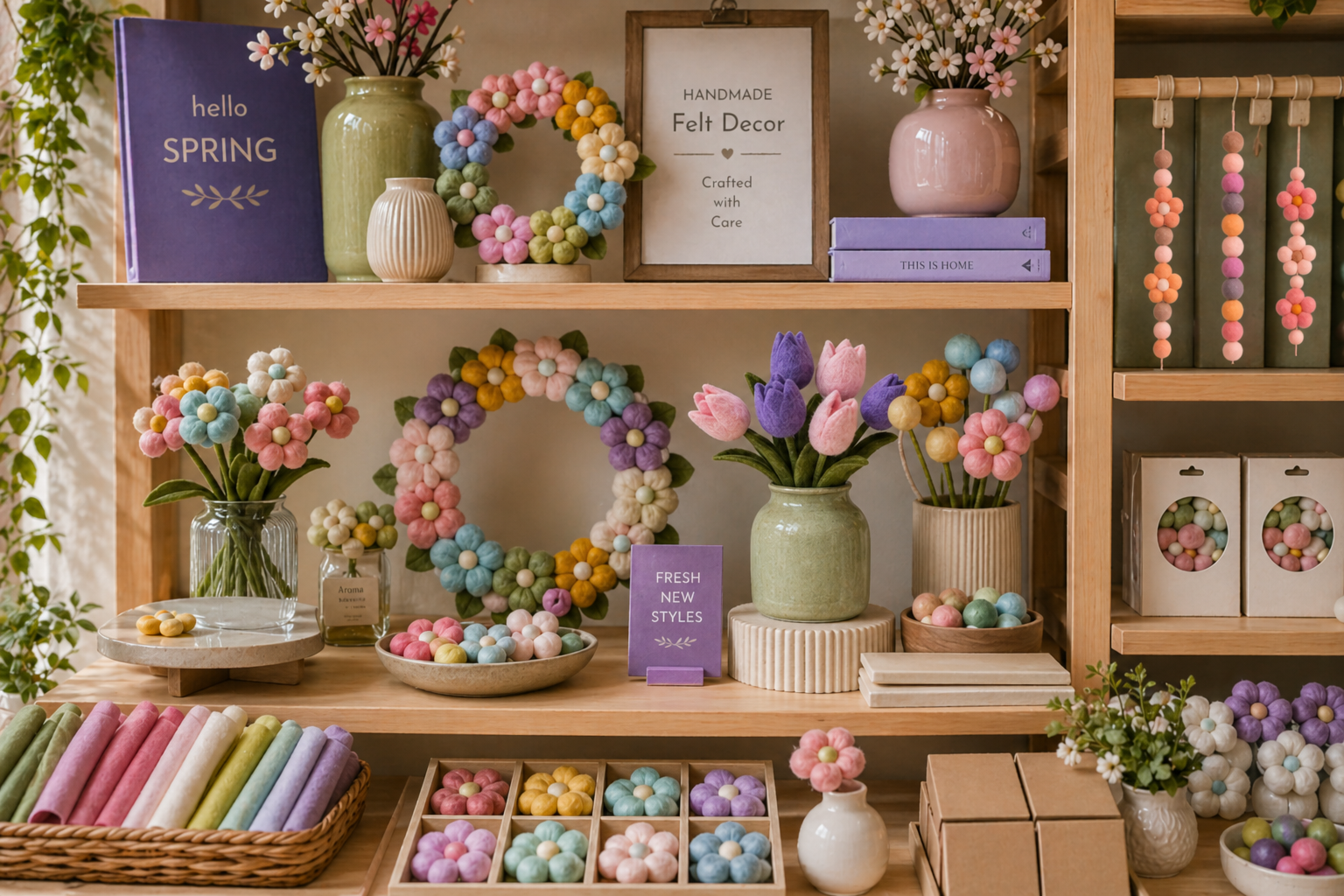 Retailers are also moving beyond purely holiday-specific decor and looking for handmade pieces that stay relevant all season. Felt coasters, table accents, mini wreaths, and felt garlands fit this shift well because they feel decorative without being limited to a single celebration. They are especially useful for gift shops and interior boutiques building spring tablescapes, shelf styling moments, and layered home collections.
