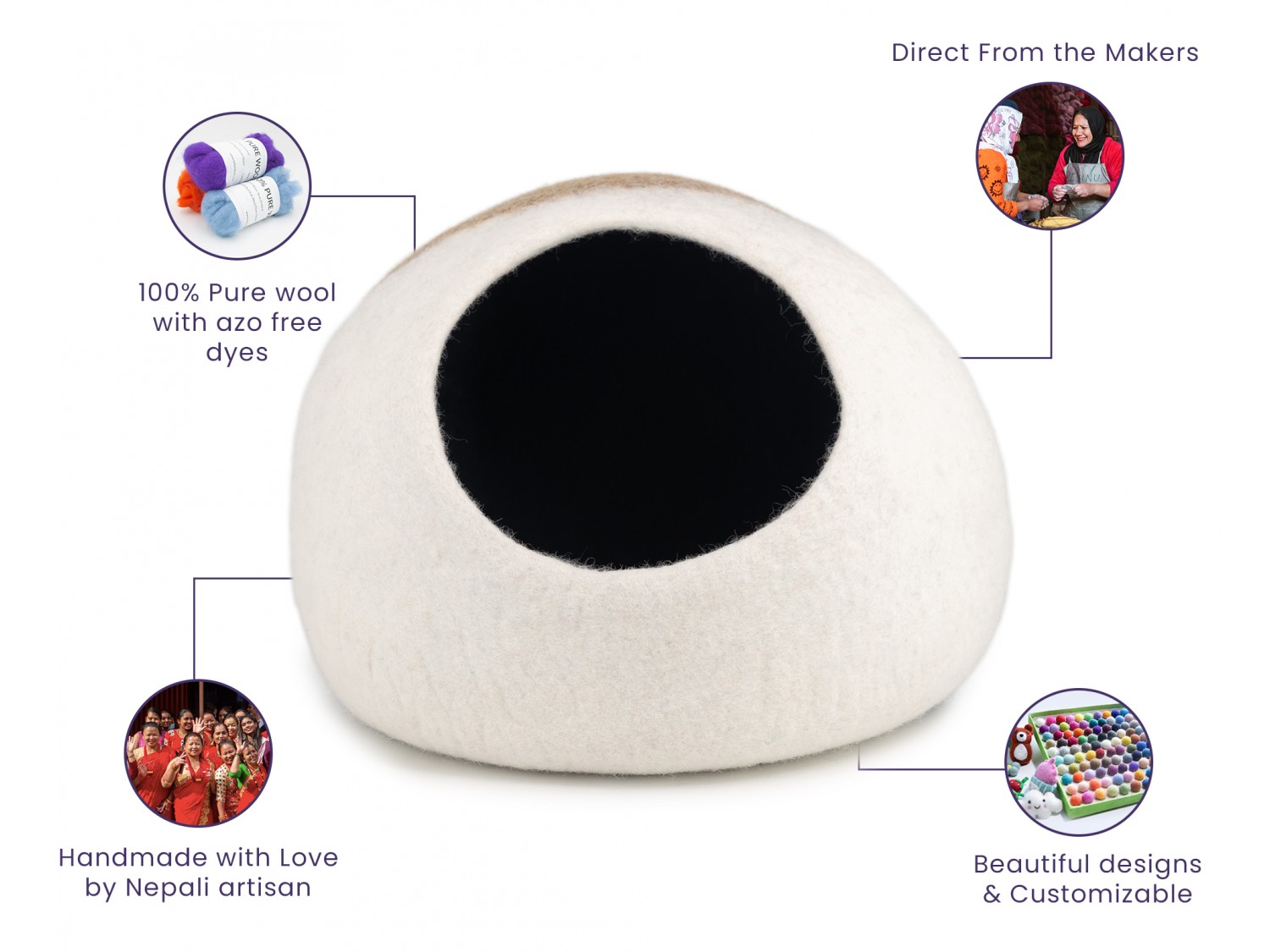- Our skilled team of female artisans makes our caves with the fine craft of merino wool felting. Employ household women, providing them with fair wages, training, and optimum working conditions in return for our environmentally friendly production process.