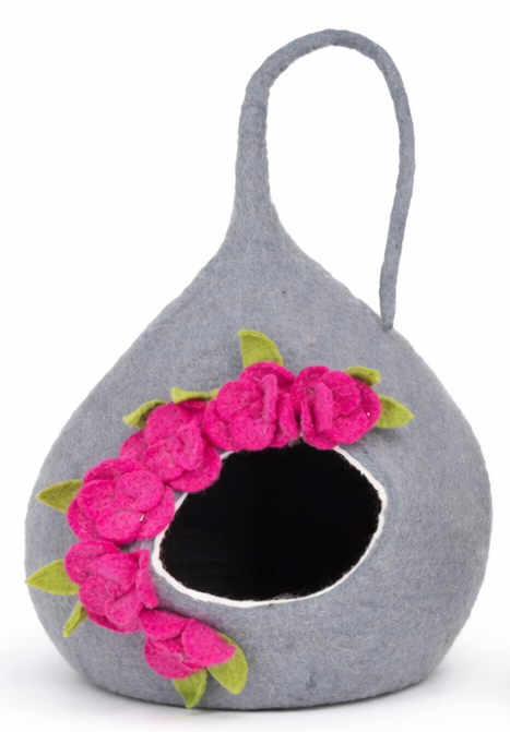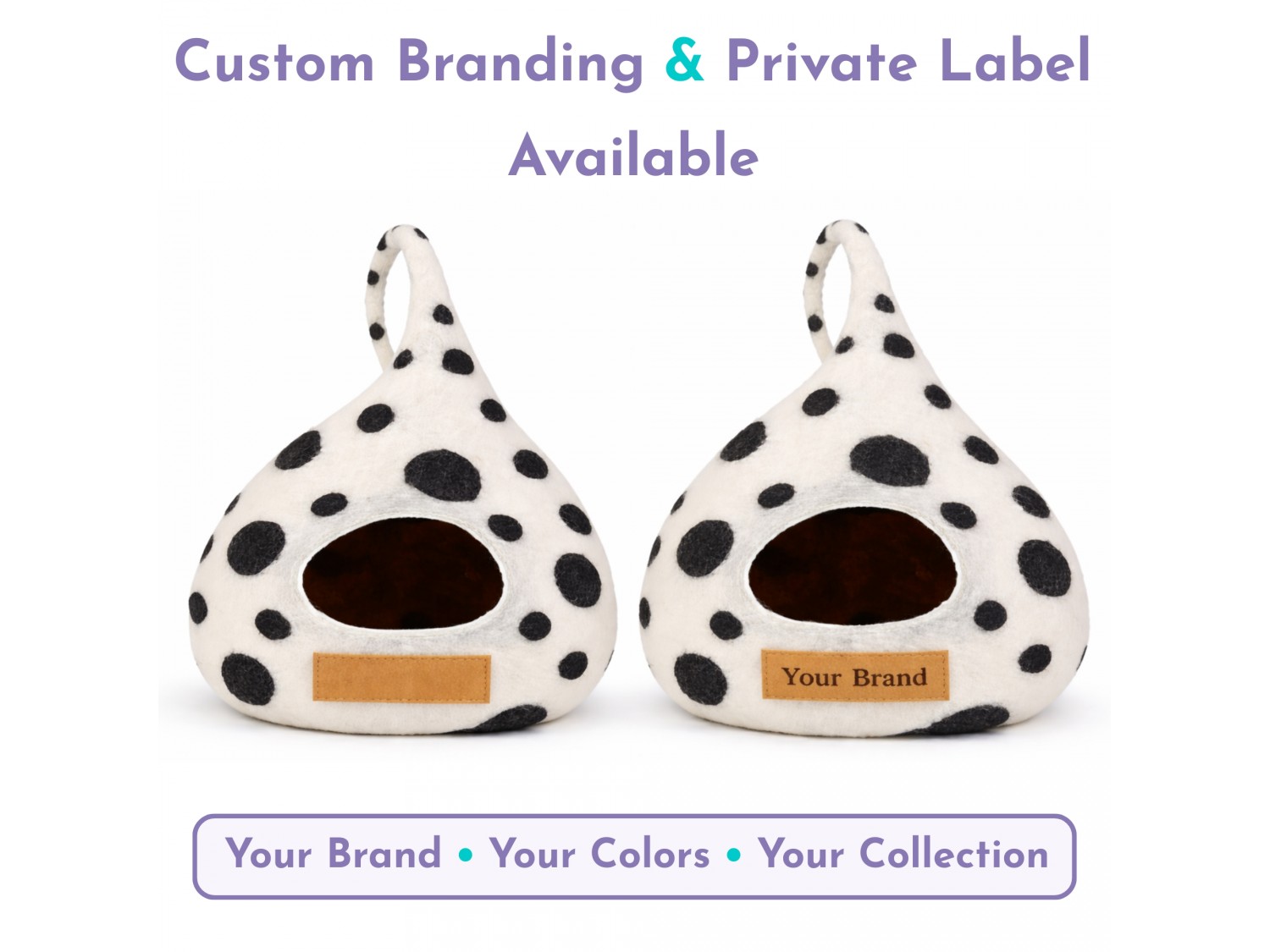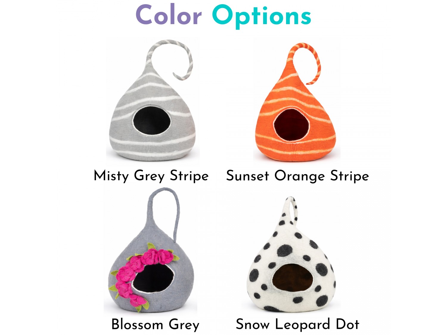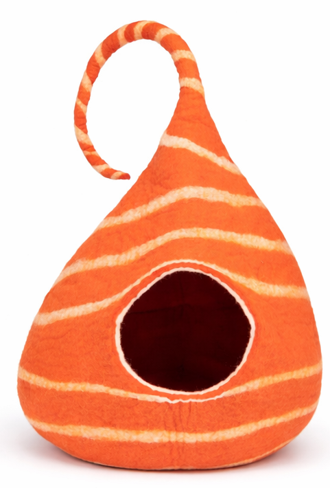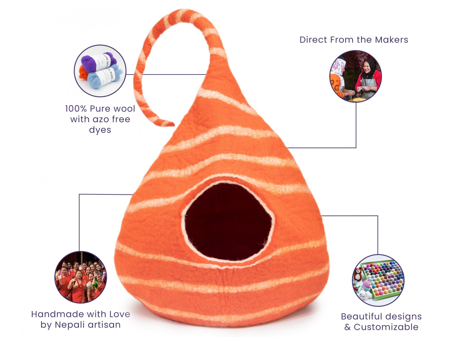 The Wholesale Unique Tendril Wool Felt Cat Cave is a statement-driven pet housing design developed for retailers, distributors, and private label brands seeking visually distinctive wool pet products. Featuring a sculptural tendril-top silhouette with decorative surface detailing including stripes, florals, and patterned finishes, this design delivers strong shelf presence and premium retail appeal. Each cave is handcrafted from 100% natural sheep wool by skilled artisans in Nepal using traditional wet-felting techniques.