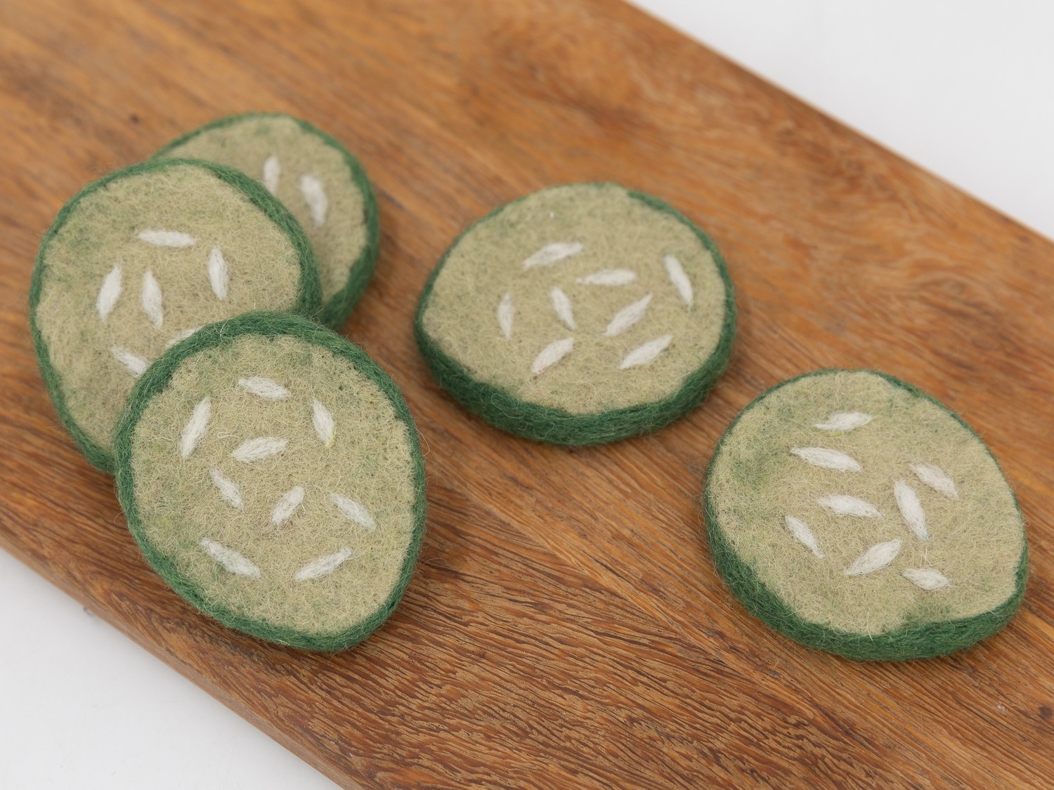 Bring the farm to your kid's playroom with our realistic Wool Felt Cucumber Slices - the perfect tool for introducing healthy food choices through play. These felted vegetables are handmade by talented Nepali women of felt and yarn, using a needle felting artwork to achieve an incredibly realistic, complete with a round shape and white seeds in the middle.
