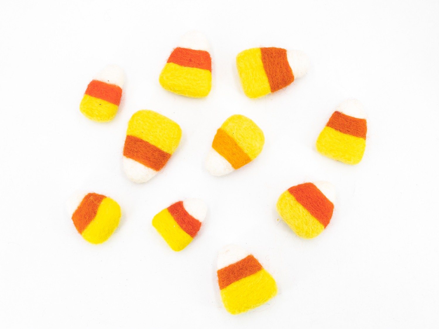 This 5cm wool felt candy corn is handcrafted from 100% natural wool sourced from New Zealand and shaped with a soft, consistent handmade finish. Its compact size, recognizable candy corn form, and durable felt structure make it suitable for Halloween décor, seasonal ornaments, garlands, craft kits, and themed display projects.
